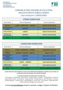 Punto 3.1 lettera d) 1. Calendario e orari vigenti relativi alla raccolta dei rifiuti urbani, con riferimento a tutte le modalità di raccolta a disposizione dell'utente, ivi inclusi i centri di raccolta e con esclusione delle eventuali modalità di raccolta per cui non è effettuabile una programmazione . 2.