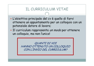 PDF Il Curriculum Vitae La lettera di presentazione In linea di massima, la lettera di presentazione ha lo scopo di introdurre il tuo CV all'azienda alla quale lo stai inviando oltre a servire per spiegare brevemente i motivi che ti hanno spinto a candidarti per una determinata offerta o auto candidatura. La lettera di presentazione può